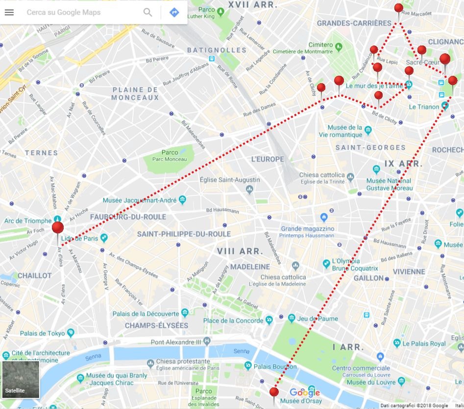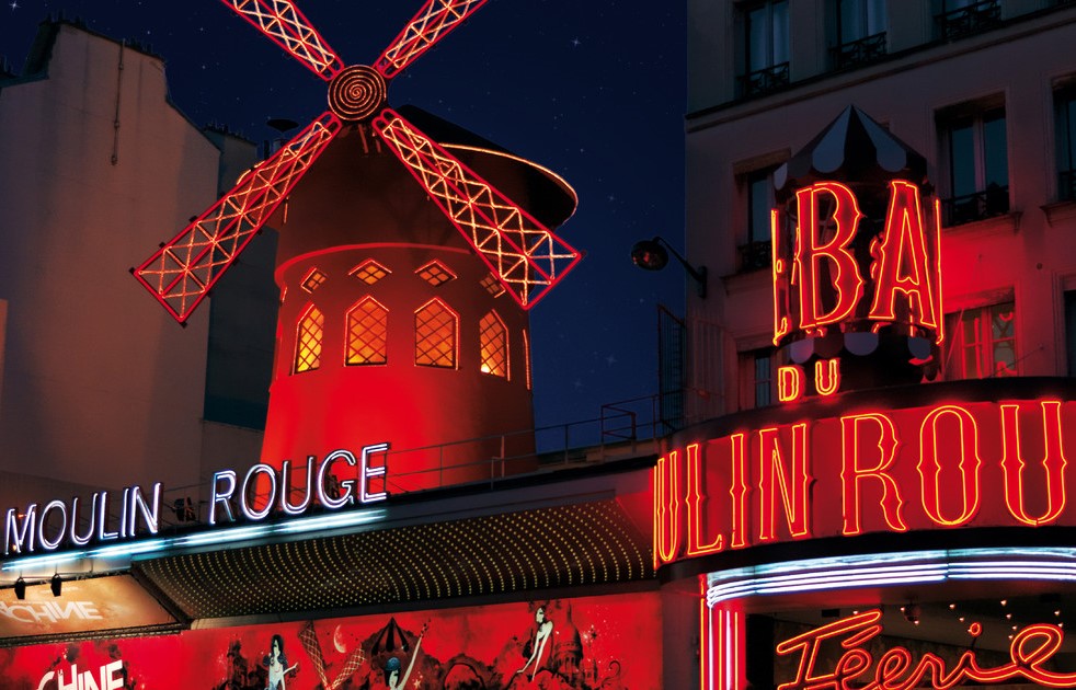 Moulin Rouge: situato nel famoso quartiere a luci rosse di Pigalle, al XVIII arrondissement di Parigi, vicino Montmartre è uno dei più famosi locali di Parigi, inaugurato il 6 ottobre 1891 da Charles Zidler. Nacque sull’onda del successo del Moulin de la Galette, un ristorante danzante ricavato nel 1870 dentro un vecchio mulino a vento nella parte alta di Montmartre. Charles Ziedler e Joseph Oller, pensarono di creare un cabaret sullo stesso stile del Moulin de la Galette a Pigalle, proprio ai piedi di Monmartre, e di costruirvi sopra un mulino ovviamente finto, vista la mancanza di vento in quella zona.