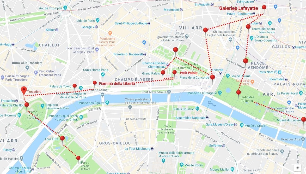 Avenue des Champs Élysées: è uno dei più larghi e maestosi viali di Parigi. Con i suoi cinema, cafés e negozi di lusso, é una delle strade più famose del mondo. Il nome fa riferimento ai Campi Elisi della mitologia. Il viale, prosecuzione della Rue de Rivoli, corre per 1914 metri attraverso l’VIII arrondissement, nella parte nord-occidentale di Parigi, da Place de la Concorde a est, con il suo obelisco, a Place Charles de Gaulle (già Place de l’Étoile) a ovest, dove si trova l’Arco di trionfo, formando parte della linea dell’Asse storico.