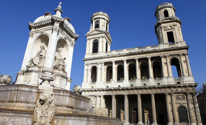 Chiesa di Saint – Sulpice: è un importante luogo di culto cattolico di Parigi, dedicato a san Sulpizio il Pio e situato in place Saint Sulpice, nel VI arrondissement della capitale francese. È la seconda chiesa di Parigi per grandezza dopo Notre-Dame ed è la sede della Compagnia dei Sacerdoti di San Sulpizio. La chiesa venne ricostruita a partire del 1645 ed il progetto affidato all’architetto Christophe Gamard su incarico dell’abate di Saint-Germain-des-Prés con la posa della prima pietra ad opera di Gastone d’Orleans. La nuova chiesa venne largamente voluta anche dal parroco, Jean-Jacques Olier, insigne teologo che fu anche fondatore dell’omonima congregazione sacerdotale con sede nella chiesa stessa.