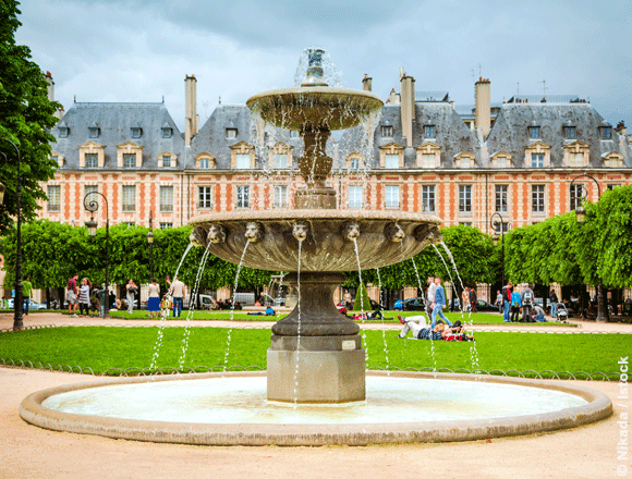 Place des Vosges: situata nel quartiere Marais, è la più antica piazza di Parigi. Caterina de’ Medici, dopo la morte del marito Enrico II, fece demolire nel 1563 l’antico Hôtel des Tournelles e realizzare come sua nuova residenza il Palazzo delle Tuileries, lasciando uno spazio libero in questo sito, che dal 1604 fu occupato da una fabbrica di tessuti in seta e da abitazioni per operai. Pochi decenni dopo, però,Enrico IV di Francia decise di realizzare l’attuale piazza, la prima piazza reale di Parigi, facendovi costruire edifici identici sui quattro lati, uno dei primi esempi di pianificazione urbanistica razionale in Francia. La piazza fu inaugurata nel 1612 in occasione dello spettacolo equestre indetto per festeggiare le nozze di Luigi XIII con Anna d’Austria. La piazza divenne luogo privilegiato dall’aristocrazia e mantenne il nome di Place Royale fino alla Rivoluzione francese, quando dal 1799 prese il nome del primo dipartimento che pagò le tasse al nuovo stato repubblicano (i Vosgi appunto).